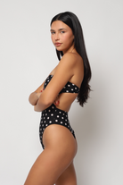 Nuestro One Piece Sabrina cuenta con una abertura en la parte de la espalda que estiliza de forma linda la figura. Tiene abertura para poner copas y las pitas son regulables se pueden sacar para usarse de modo strapless.